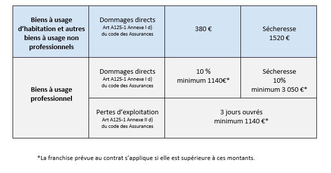- Pour les biens à usage d’habitation et les véhicules automobiles, le montant de la franchise catastrophe naturelle s’élève à 380 €.