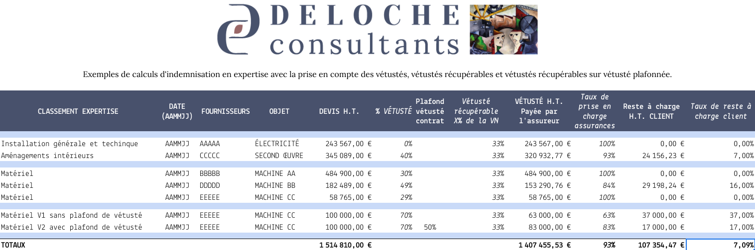 Exemples de calculs d’indemnisation en expertise avec la prise en compte des vétustés, vétustés récupérables et vétustés récupérables sur vétusté plafonnée.